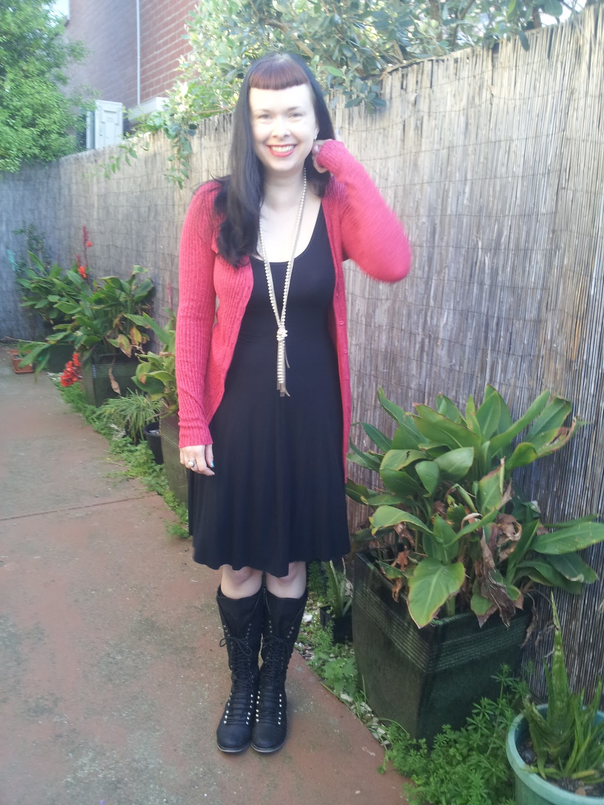 With long sleeves I think it looks better. As long as I don't gain or lose any substantial amount of weight before next winter I'll be happy to wear it then! (I will also not tuck my blouse into my tights when I wear it in public... mmm, hot)